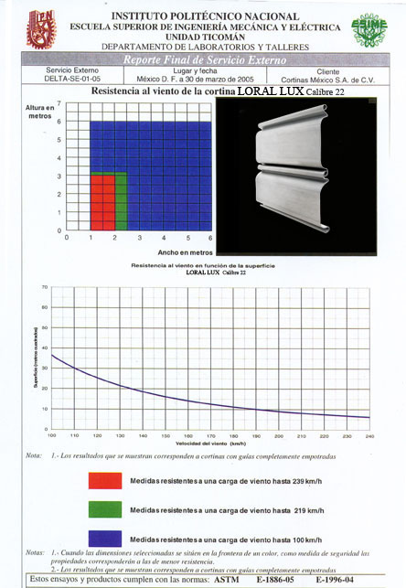 Al igual que todas nuestras tabletas, la “Loral Lux” cuenta con estudios de resistencia al viento elaborados por el Instituto Politécnico Nacional bajo las normas ASTM E-1886-05 y E-1996-04.